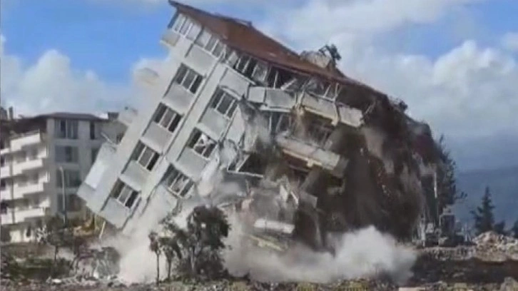 Kahramanmaraş merkezli 6 Şubat deprem felaketinde ağır hasar alan 6 katlı bir bina halatla çekilerek yıkıldı. Binanın domino taşı gibi devrildiği anlar kameralara saniye saniye yansıdı.