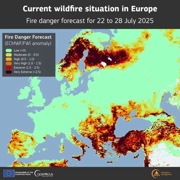 Harita verilerinde, İtalya'nın güney kıyıları, Norveç, İsveç ve Finlandiya gibi ülkelerde yangın riski “çok aşırı” seviyede gösterilirken, hava sıcaklıklarının bu ülkelerde normalin çok üzerinde seyrettiği ve kuru havanın etkili olduğu belirtildi.