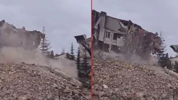 Elazığ’da 6 Şubat 2023'te Kahramanmaraş merkezli depremlerde ağır hasar gören binaların yıkımı devam ediyor. Merkez Sürsürü Mahallesi’nde ağır hasarlı 4 katlı binanın çevre güvenliğinin alınmasının ardından yıkımına başlandı. Binanın yıkımı sırasında iş makinelerinin yanı sıra ses dalgalarından da faydalanıldı. Binanın belirli noktalarına korna sesiyle destek verildi. İş makinelerinin müdahalesi ve ses dalgalarının etkisiyle 4 katlı bina yıkıldı.