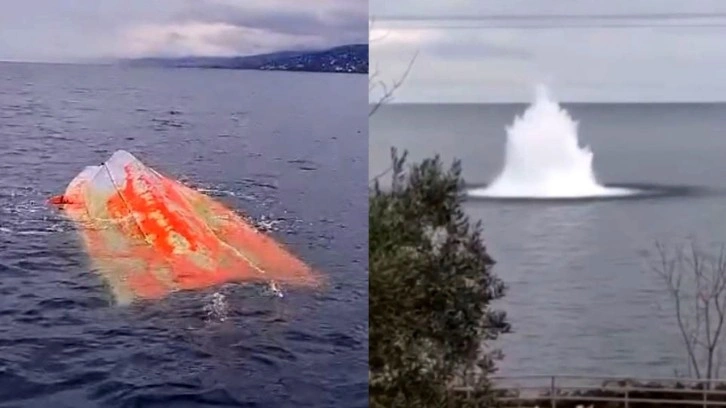 Trabzon'un Akçaabat ilçesinde kıyıdan 100 metre uzakta ters dönmüş boş tekne, Rusya- Ukrayna savaşında sabotaj amaçlı kullanıldığı şüphesi üzerine SAS timlerinin incelemesi sonrası fünye ile patlatıldı. Patlatma anları cep telefonu kamerasıyla kaydedildi.