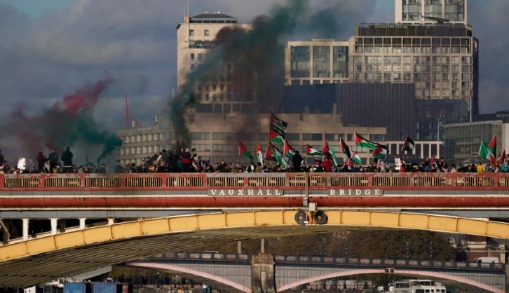 Londra'da 5 haftadır devam eden Filistin'le dayanışma yürüyüşleri kapsamında Filistin yanlısı göstericiler Hyde Park'tan ABD'nin Londra Büyükelçiliği önüne yürümüştü.