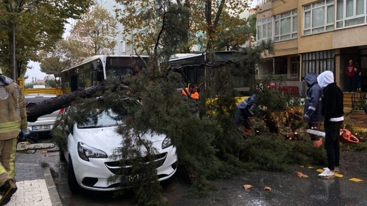 Cadde kenarında bulunan çam ağacı, sağanak yağış ve rüzgarın etkisiyle park halindeki 34 ABK 882 plakalı otomobilin üzerine devrildi.
