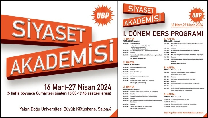 UBP Siyaset Akademisinin çalışmaları, 16 Mart Cumartesi günü Yakın Doğu Üniversitesi Büyük Kütüphane Salon 4’de saat 15.30’da Akademi Koordinatörü UBP Meclis Grup Başkan Vekili, Lefkoşa İlçe Başkanı Ahmet Savaşan, UBP Genel Sekreteri Oğuzhan Hasipoğlu ile UBP Genel Başkanı, Başbakan Ünal Üstel’in açış konuşmaları ile başlayacak.