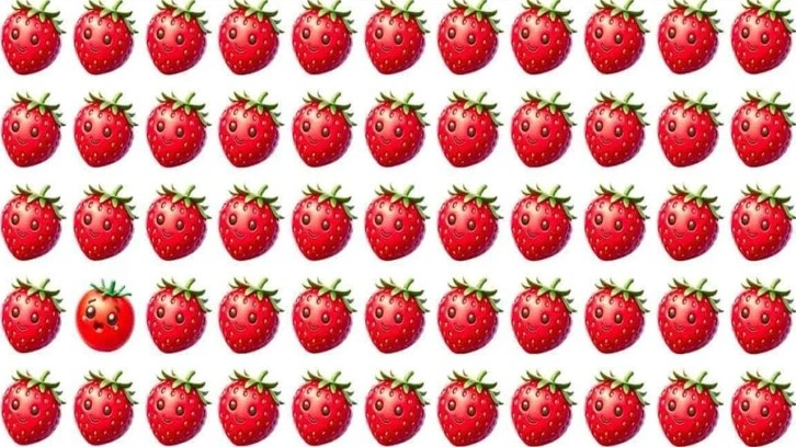 Optik illüzyonlu bir zeka testi ile daha karşınızdayız. Bir sayfa dolusu çileğin göründüğü bu resimde farklı bir nesne daha var. izlerde istenen resimdeki farklı nesneyi 5 saniye gibi kısa bir sürede bulmanız.