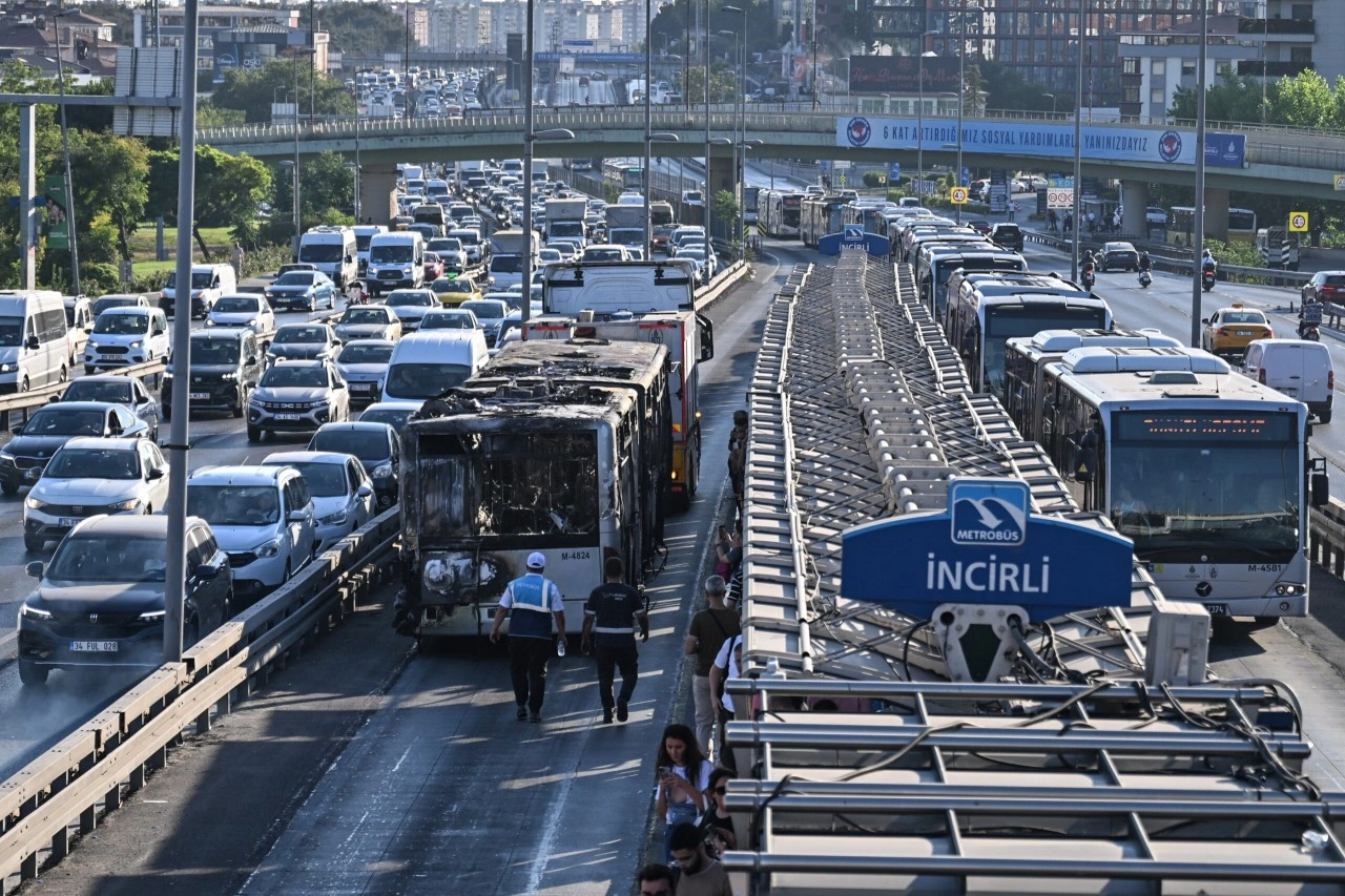 Yangın nedeniyle her iki istikamette de metrobüs seferleri durdurulurken, bölgede uzun metrobüs kuyruğu oluştu.