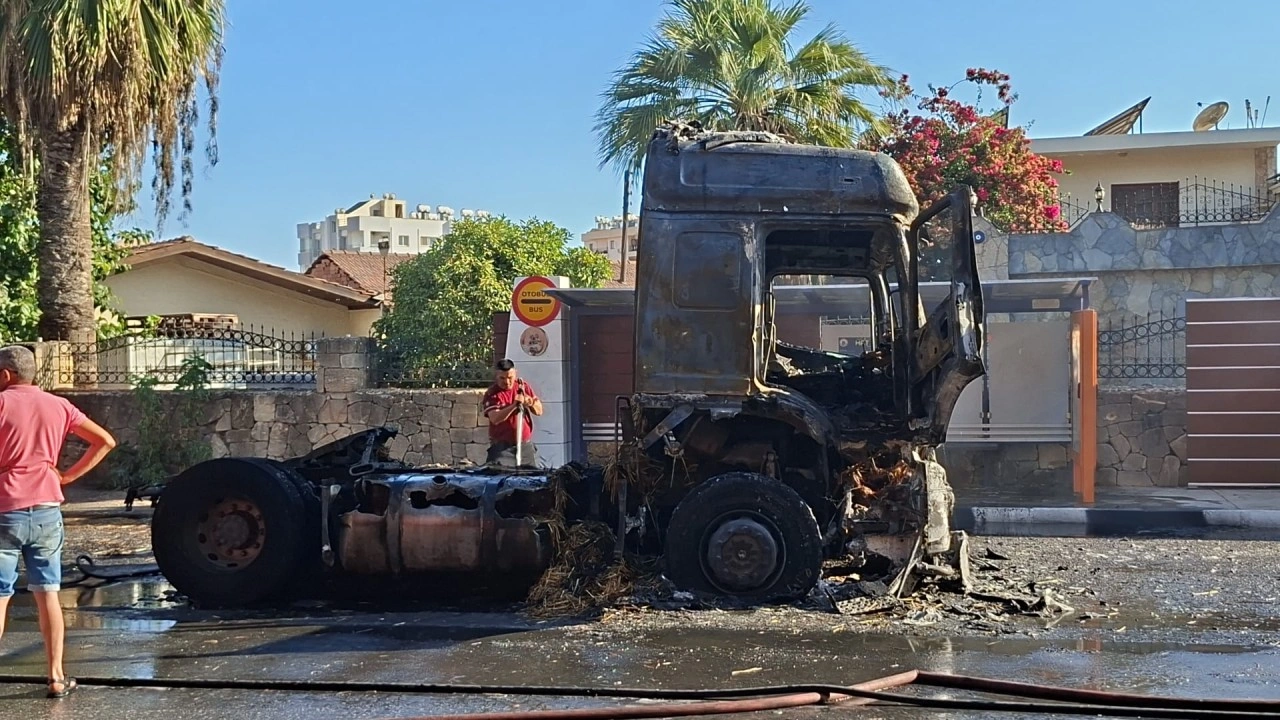 “03.07.2025 tarihinde, saat 17.00 sıralarında, Mustafa Kemal Bulvarı üzerinde Sema Otel önlerinde, seyir halinde bulunan ve arkasında balya yüklü tır araçta henüz tespit edilemeyen sebepten dolayı yangın meydana geldi. Yangına polis itfaiye ekipleri ile Gazimağusa Belediyesi ve özel şirketlere ait su tankerleri ile müdahale edildi. Yangın sonucu bahse konu tır araç ve arkasında yüklü bulunan balyalar yandı. Alevlerin tır aracın yakınında park halinde bulunan UY 261 plakalı araca sirayet etmesi sonucu da konu araç kısmen yanarak maddi hasar meydana geldi. Soğutma çalışmaları devam ediyor.”