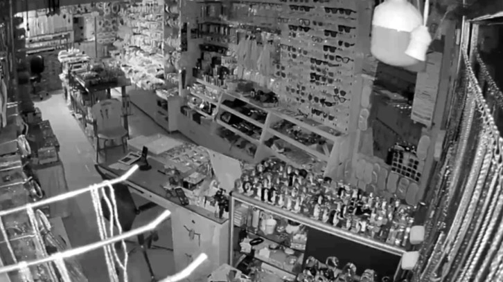 Bir iş yerinin güvenlik kamerası görüntülerine 4,7 büyüklüğündeki depremle, ürünlerin sallandığı görülüyor.