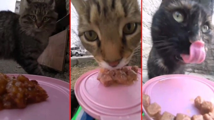 Kedilerin mamaları görünce ve mamayı yerken verdikleri tepkiler gülümsetti.