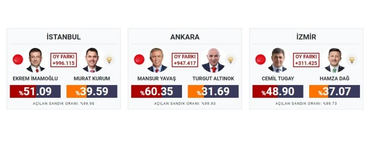In Istanbul wurde der Bürgermeister Ekrem İmamoğlu mit 51 % der Stimmen wiedergewählt, während in Ankara Mansur Yavaş mit über 60 % erneut zum Bürgermeister gewählt wurde. In İzmir setzte sich Cemil Tugay mit fast 49 % der Stimmen durch.