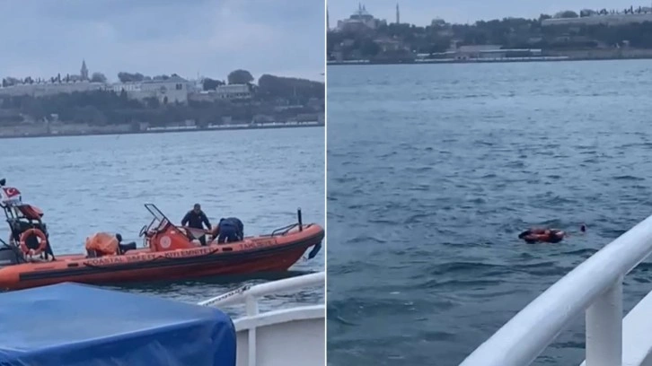 Görüntülerde, denize düşen yolcunun olay yerine gelen Kıyı emniyeti ekipleri tarafından kurtarılma anları yer alıyor.