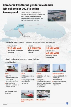 Bu çerçevede günlük 2,7 milyon metreküp üretimin sağlandığı Zonguldak açıklarındaki Sakarya Gaz Sahası'nda çalışmalar yürüten sondaj ve sismik arama gemileri ile gaz tespit edilen kuyularda sondaj çalışmaları yapılıyor ve gaz potansiyeli bulunan noktalarda arama faaliyetleri gerçekleştiriliyor.