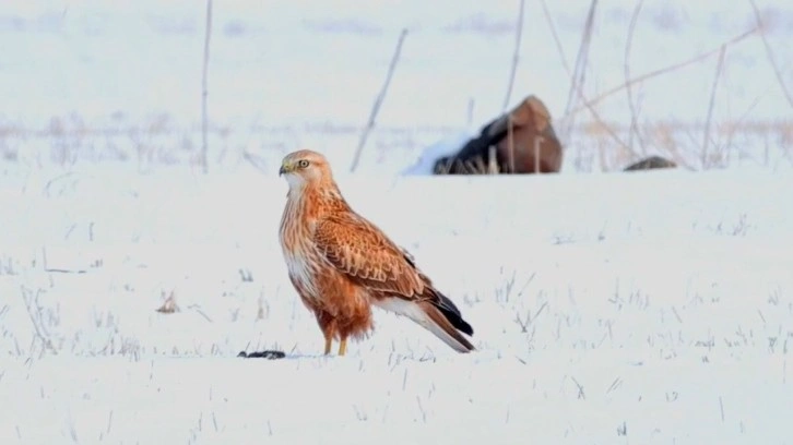 Yılan, kertenkele, kör fare hatta tavşan gibi türleri de avlayarak hayatını idame ettirmeye çalışan kızıl şahinler, karla kaplı arazide avlanırken görüntülendi.