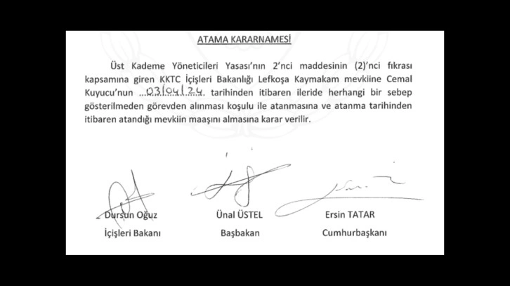 Resmi Gazete’de yayımlanan karara göre Lefkoşa Kaymakamı Bora Akkuş görevden alındı.
