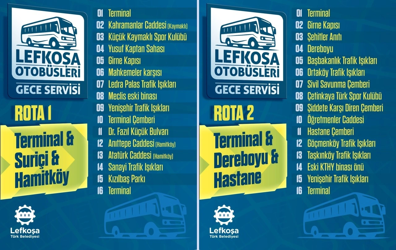 Lefkoşa Türk Belediyesi, haftanın 5 günü (Salı-Cumartesi) 19.00-01.00 saatleri arasında Lefkoşa genelinde toplu taşıma hizmetine başlıyor. 1 Temmuz Salı günü başlayacak ve 2 rota şeklinde hizmet verecek Lefkoşa Otobüsleri Gece Servisi’nin başlangıç ve bitiş noktası Otobüs Terminali olacak. Lefkoşa Toplu Taşıma Şirketi (L.T.T) ile imzalanan sözleşme kapsamında verilecek hizmetin bedeli her kullanım için 55 TL olacak ve kredi kartı ile ödenebilecek.