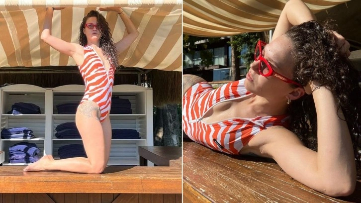 Turuncu beyaz çizgileri olan mayosuyla poz veren ünlü ismin dövmesi de dikkatlerden kaçmadı.