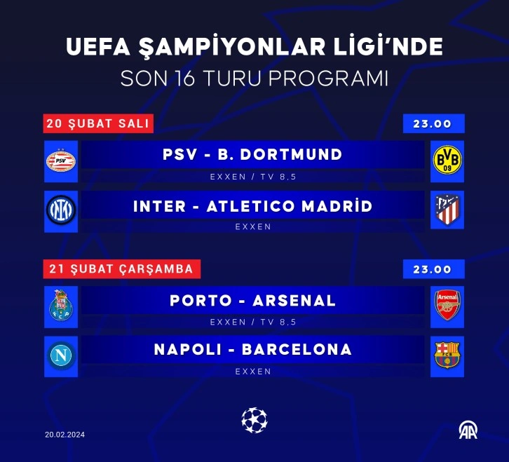 Yarın ise Porto ile Arsenal ve Napoli ile Barcelona karşı karşıya gelecek. Çeyrek finale yükselecek takımlar, 5-6 ve 12-13 Mart tarihlerindeki rövanş karşılaşmaları sonucunda belli olacak.