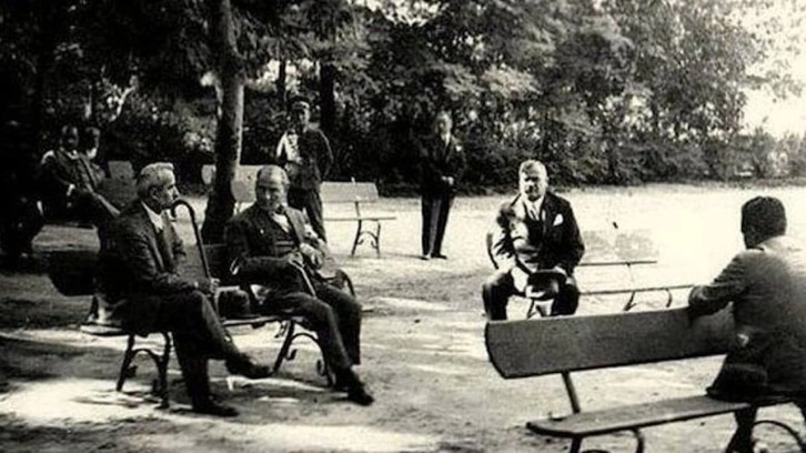 9 Ağustos 1928 tarihli bu fotoğraf, Türk tarihi açısından önemli bir öze dönüşü, bir devrim anını temsil ediyor. Gülhane Parkı'nda çekilen karede, Mustafa Kemal Atatürk, İsmet İnönü ve Kılıç Ali yer alıyor. Türk dili açısından yeniden doğuşu temsil eden Harf Devriminin yapılacağı ve Türk harflerinin halka tanıtılacağı gün çekilen fotoğrafta Atatürk, yazı tahtasının gelmesini beklerken bir banka oturuyor.